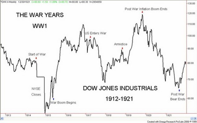 The stock markets were a see-saw affair during WW1. When war broke out the NYSE closed fearing a wave of selling from Europe. The stock market fell bottoming when it re-opened in late 2014. The market recovered and by mid-1915 or so the war boom got underway in the US because US corporations were benefitting substantially from the war. The boom essentially lasted until the US entered the war in April 1917. What followed was a devastating bear market although it did not fall as deep as the 1914 market. As the tide shifted in favour of the allies the market began a recovery. But it took until after the November Armistice for the post-inflationary war boom to get underway. The inflation boom ended when the Fed tightened and the bubble burst resulting in a bear market that took the markets below the lows of 1917 by 1921.