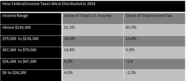 According to the Tax Policy Center, those in the top quintile of earners were responsible for paying 83.9 percent of all income taxes in 2014. Those in the bottom quintile, on the other hand, “paid” a negative rate of -2.2 percent.