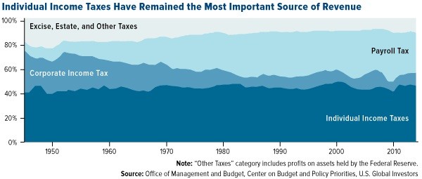 This has been the case since at least 1945. Even as the share of corporate taxes has shrunk and payroll taxes increased over the course of seven decades, the share of individual income taxes has remained pretty steady in the 40- to 50-percent range.