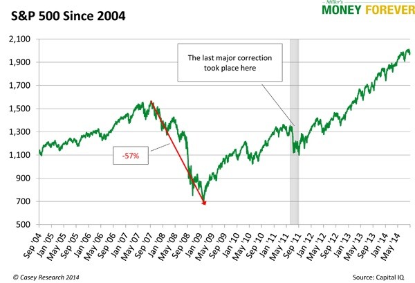 The Federal Reserve has succeeded in forcing savers to take billions of dollars out of fixed-income investments to hunt for better yields. Take a look at the chart below showing the S&P 500’s performance since 2004. The Index has almost tripled since its 2009 bottom. There hasn’t been a major correction in well over 1,000 days.