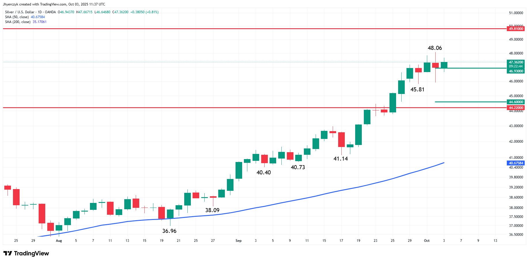 LONDON (October 3) Spot silver is trading firmer Friday, holding above a key technical pivot at $46.93 as bulls aim for another run at the multi-year high at $48.06. The market is drawing support from growing confidence in near-term Federal Reserve rate cuts and a softening U.S. dollar, even as Treasury yields tick higher in response to a government data blackout.