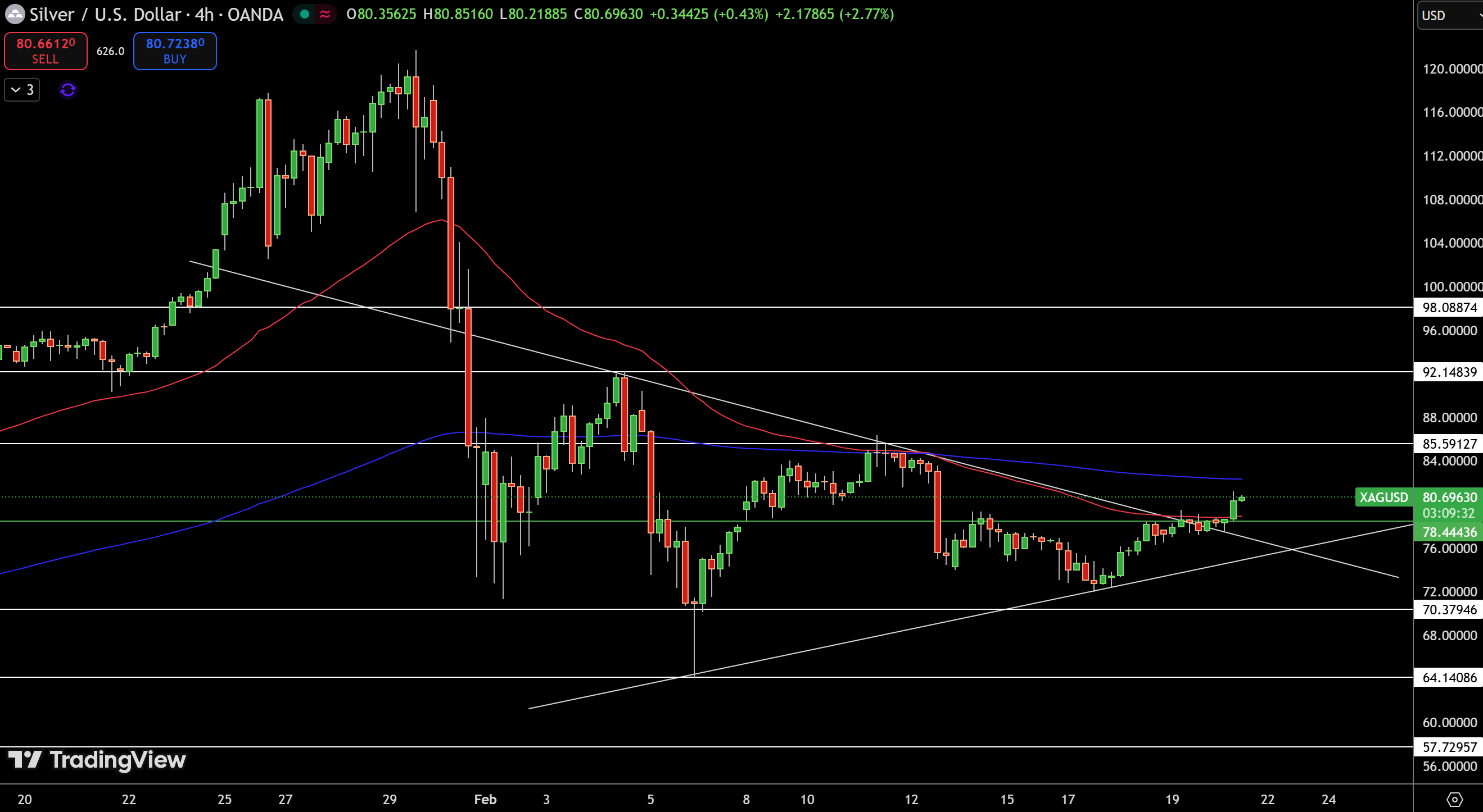 Silver is trading right around $80.69 on the 4 hour chart after finally breaking above $78.44 resistance. Which is a pretty big deal, especially since it signals that silver is out of the contracting triangle that had formed between the $98.08 high and $64.14 low.