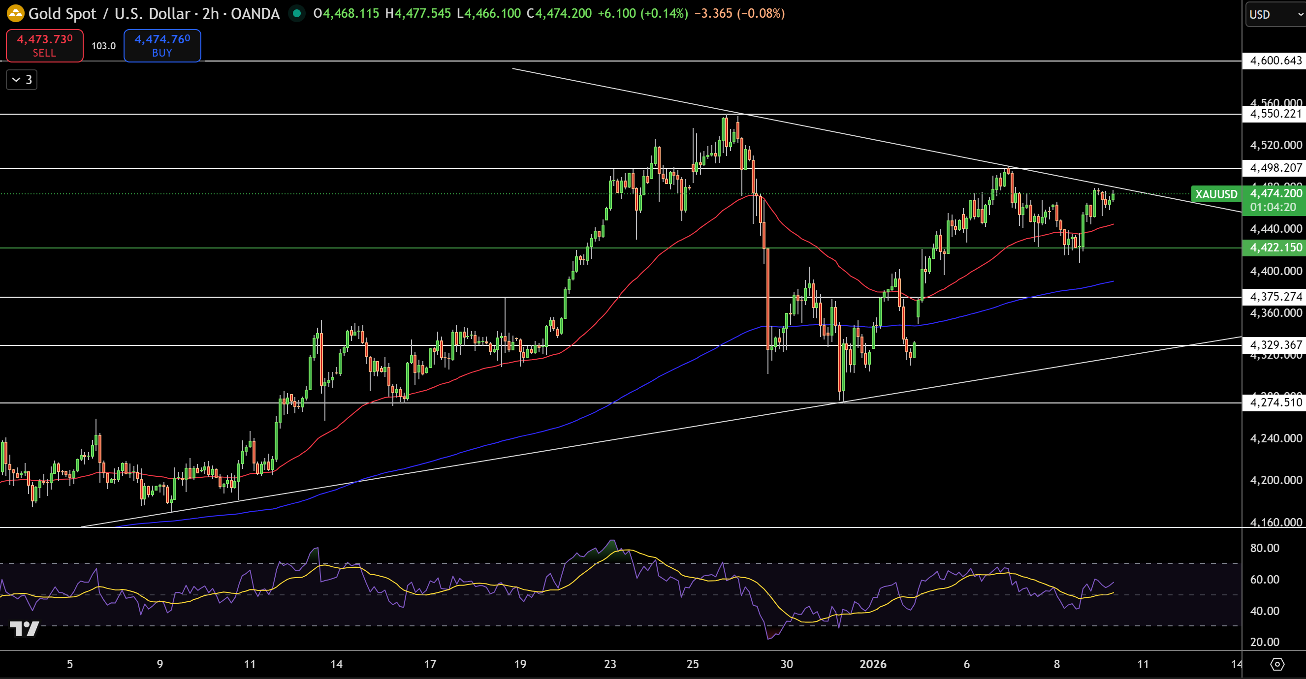 Gold (XAU/USD) is trading near $4,474 on the 2-hour chart, consolidating below a descending trendline drawn from the $4,550 peak. Price action remains constructive, with higher lows supported by an ascending trendline from the late-December low near $4,275, forming a tightening triangle structure. Recent candlesticks show smaller bodies and mixed wicks, signaling indecision rather than distribution.