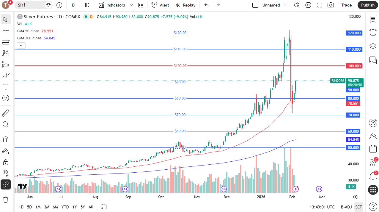 NEW YORK (February 4) Silver has broken above the $90 level during early trading on Wednesday and looks like it wants to test the $100 level eventually.