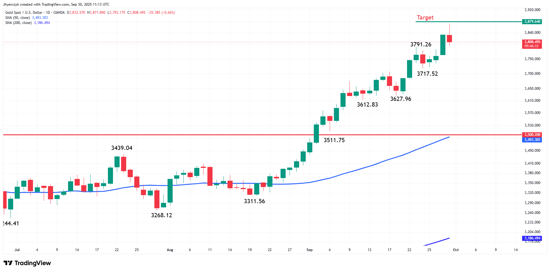 Silver’s pullback is also being influenced by technical weakness in gold. Spot gold hit a record $3871.89 before reversing sharply lower, falling just shy of a major swing target at $3879.64. That reversal pattern may trigger a short-term correction in gold, with near-term support seen at $3794.70, and deeper targets at $3749.92 and $3742.36.