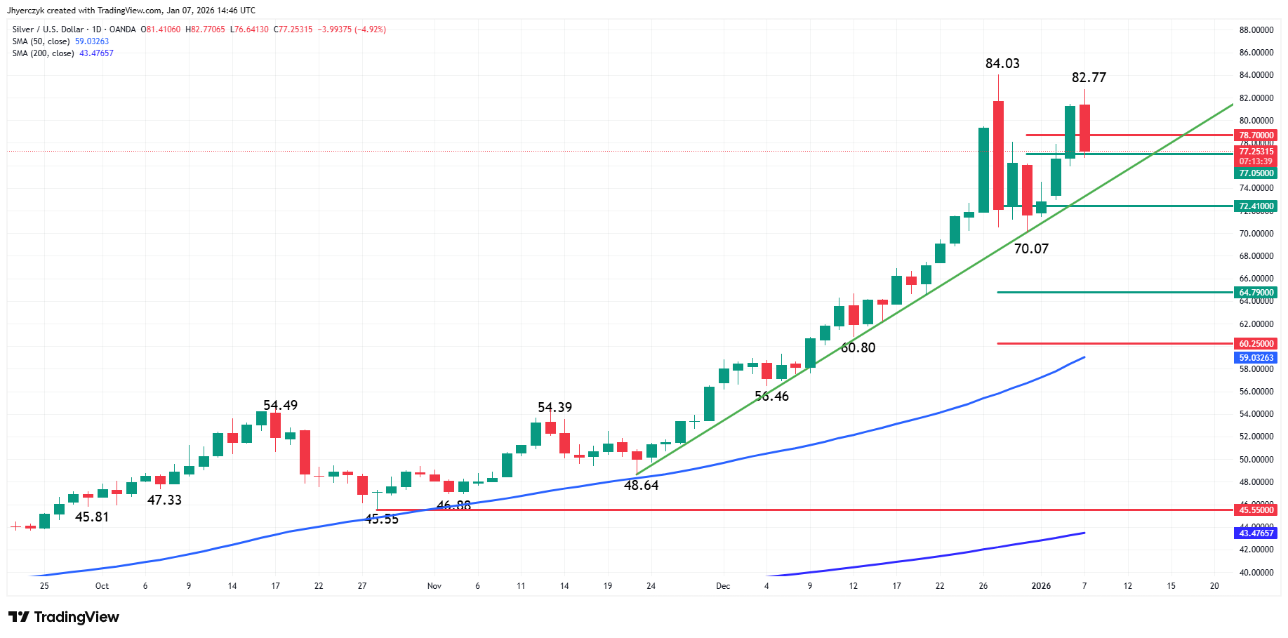 Silver (XAG) Forecast: Bulls at Crossroads – Defend $77.05 or Fall to $73.24 Trendline