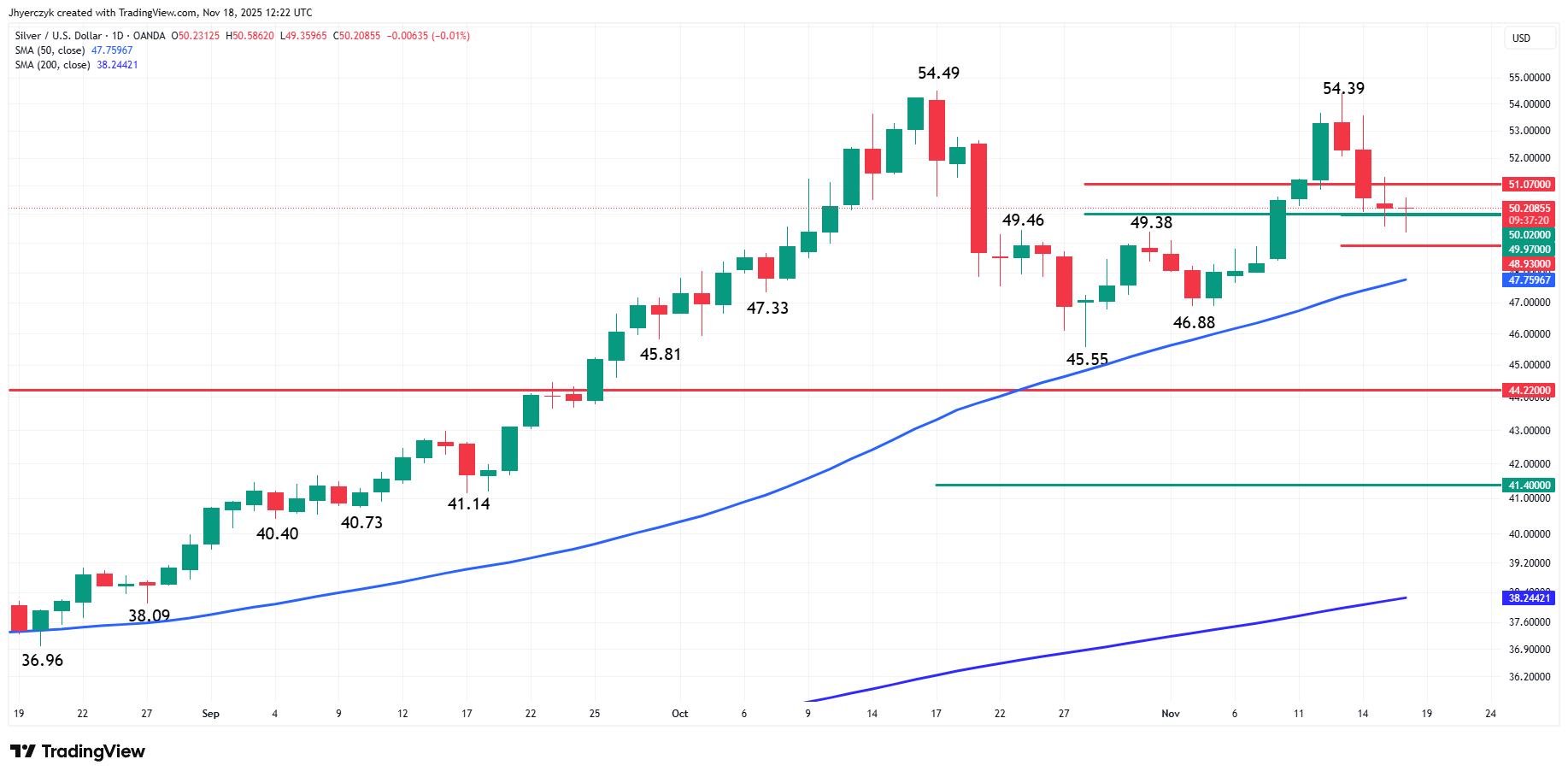 LONDON (November 18) Silver (XAGUSD) is drifting lower on Tuesday, holding just above the tight support band between $50.02 and $49.97. The market is reacting to the same pressure weighing on gold, where traders have sharply reduced expectations for a December Federal Reserve rate cut.