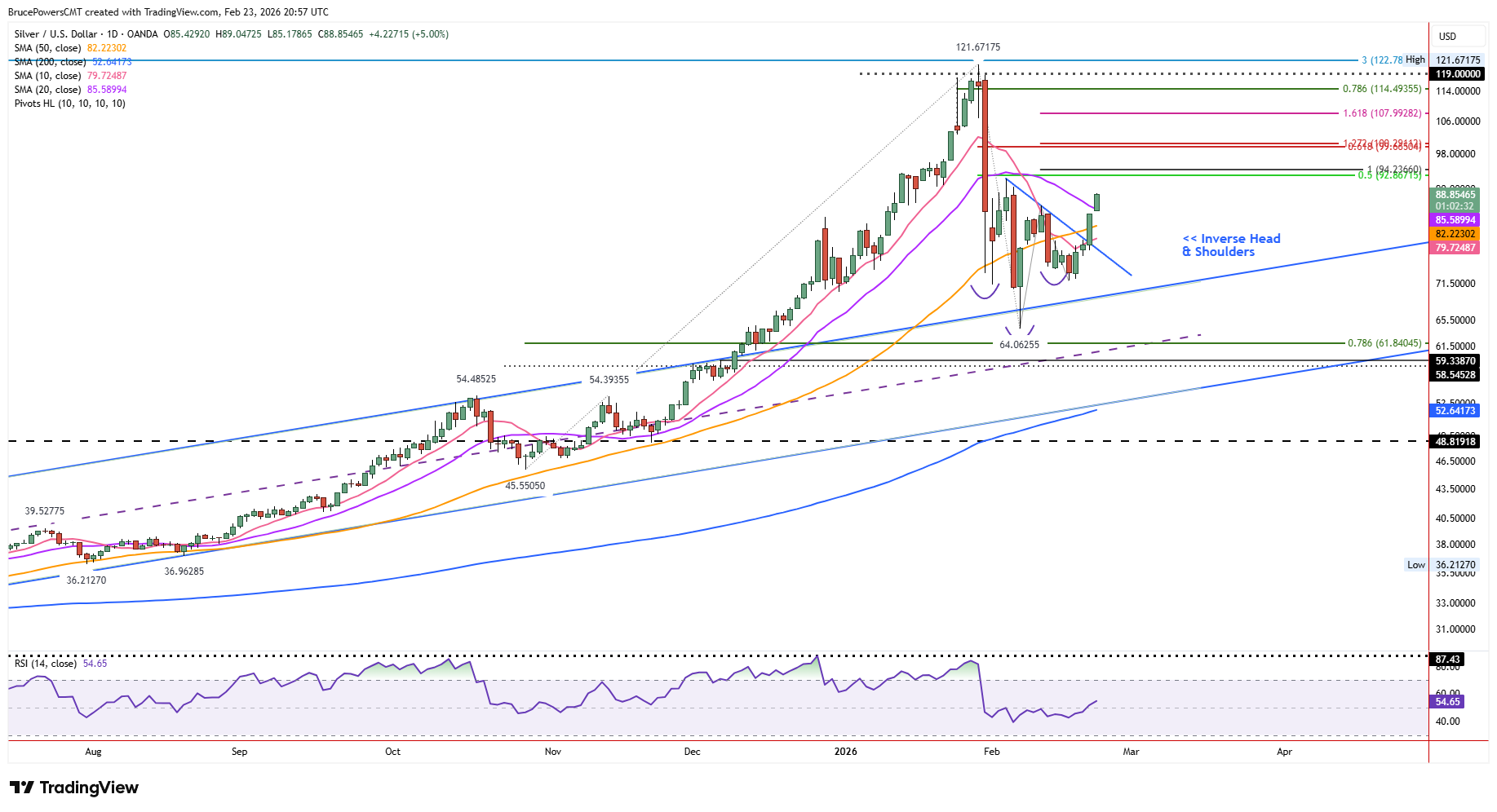 NEW YORK (February 23) Silver broke out of an inverse head and shoulders pattern on Friday above $79.50 and then continued to advance on Monday. Both a lower swing high at $86.32 and the 20-day moving average at $85.53 were recovered on Monday. The 50-day average at $82.20 was reclaimed earlier on Friday. Silver reached a new breakout high of $88.03 and a 12-day high during Monday’s advance. A daily close above $86.32 will be needed to further confirm the breakout of the head and shoulders bullish reversal pattern.
